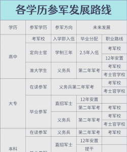 全日制学历,含军衔晋升通道(如考取军官学校可获本科,士官学校获大专)。 - 要求:需通过军考和提干选拔,文化知识与军事素质并重。 - 机会:青年士兵第2年或士官第1年可报名,学信网可查学历。