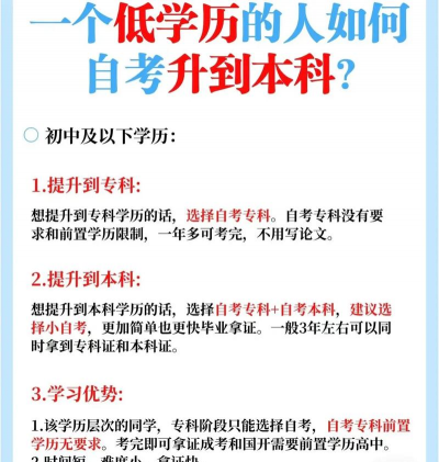 需参加全国统一入学考试,录取后可选函授、业余或全日制学习,学制2.5-3年。 - 优势:通过率较高,学习形式灵活(含面授辅导),适合有一定学习基础者。 - 适合人群:高中起点或中专学历者,希望快速获得学历证书。