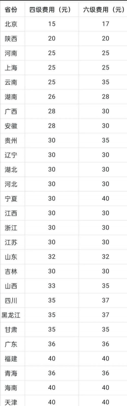 部分省份收费标准不同,例如山西省CET四级33元,广西壮族自治区35元。