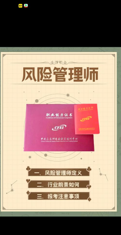 考试性质 风险管理师证书由国家人力资源和社会保障部备案的评价机构组织,属于职业资格证书,用于评估风险管理岗位的专业能力。