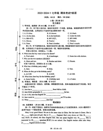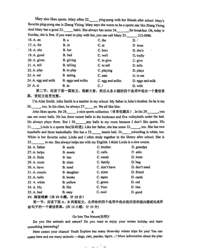 英语 英语是初一的核心外语科目,考试内容通常包括: