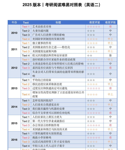 - 英语一: 难度略高于英语二,侧重阅读理解、写作和翻译,对词汇量和阅读速度要求较高。 - 英语二