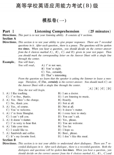 - A级侧重考查考生的综合英语应用能力,包括词汇、语法、阅读、写作等,难度高于B级。