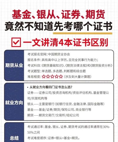 通过率:基金从业(53%)>期货(30%)>银行(40%)>证券(30%-40%)。