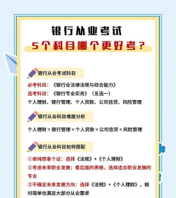 - 科目:《银行业法律法规与综合能力》(必考)+《银行业专业实务》(可选1-5个专业类别)。
