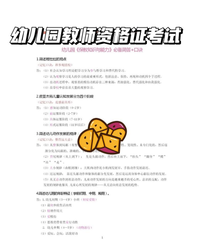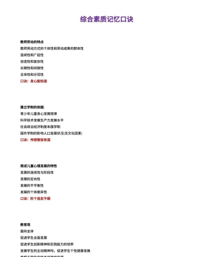 关于幼儿教师资格考试,以下是综合整理的口诀及知识点,涵盖教育理念、课程特点、教师素养等核心内容: