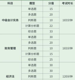 考试时间:每科考试时长分别为165分钟(实务)、135分钟(财务)、120分钟(经济法)。