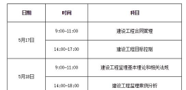 - 5月17日: - 上午09:00-11:00《建设工程合同管理》; - 下午14:00-17:00《建设工程目标控制》(3个专业)。 - 5月18日