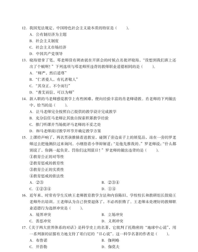 职业理念与职业道德 主要考查教师职业规范、教育观、学生观等核心素养,通常以案例形式出现,每题4个选项,共29道题(科目一)。