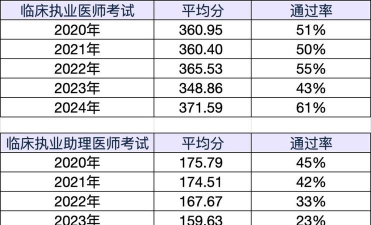 - 助理医师资格考试通过率更低,近年低于 20%。