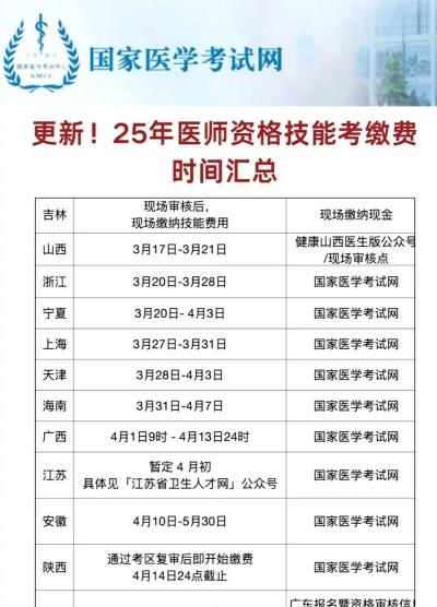 建议考生及时关注当地卫生局、县/区卫生计生委或医学考试中心等网站公告,以免错过缴费时间。