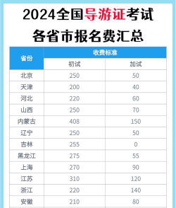 全国导游资格考试包含《政策与法律法规》《导游业务》《全国导游基础知识》《地方导游基础知识》《导游服务能力》五科,费用在 100-300元/人之间,例如:
