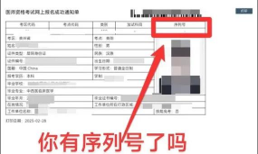 序列号出现在《医师资格考试网上报名成功通知单》上,表示考生已通过 考点初步审核,进入考区复审阶段。