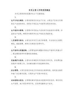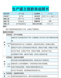 工程生产部主管通常负责公司或工厂中与工程、生产、制造相关的管理工作,具体职责因行业不同(如制造业、建筑、电子、汽车等)会有所差异,但总体来说,其核心职责包括以下几个方面: