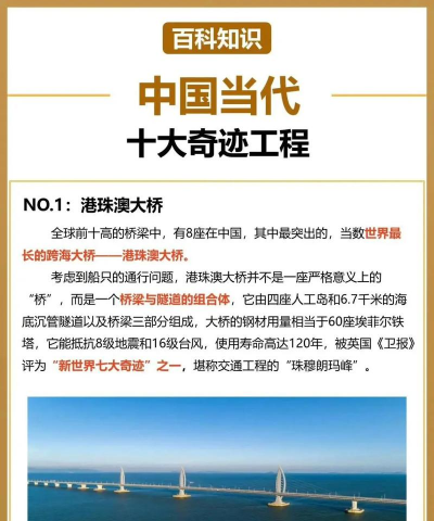 如港珠澳大桥(世界上最长的跨海大桥)、杭州湾跨海大桥、青藏铁路等,都是世界级的工程奇迹。