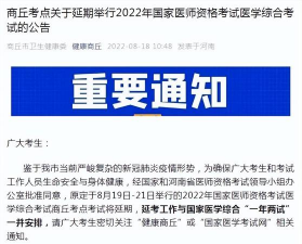 2022年,受新冠疫情影响,原定于2022年8月20日-22日举行的执业医师资格考试综合笔试部分地区延期举行,如安徽、青海、湖南等地,最终延期至9月18日至20日。