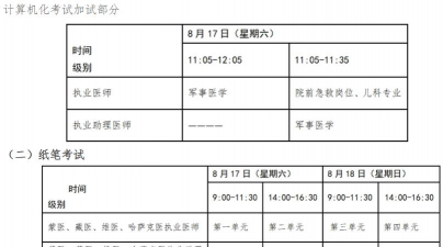 采用多站测试的方式,具体考试时间由各省、自治区、直辖市省级医师资格考试领导小组组织实施,一般每个科目的考试时间为3到4个小时不等。